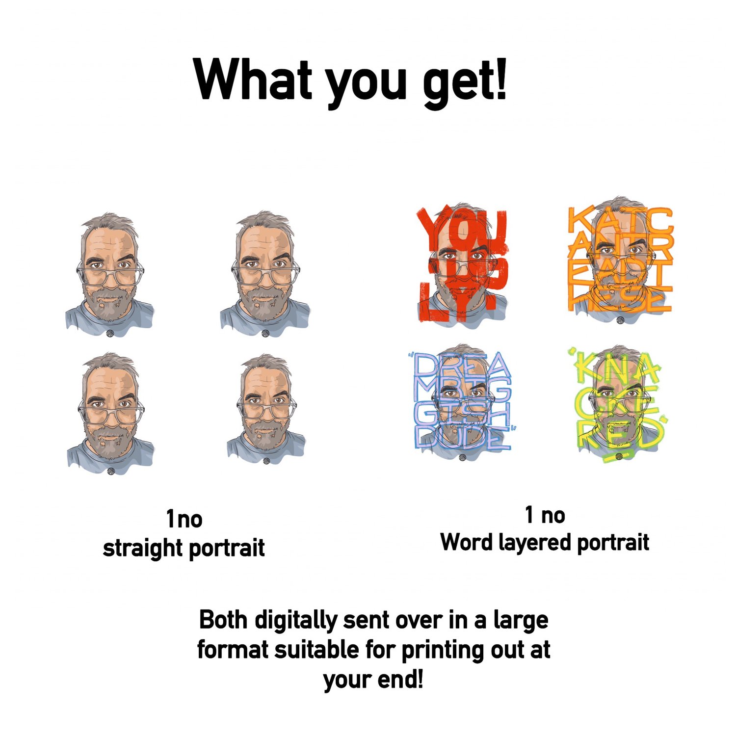 Once payment is made what I will need 4 straight on 'looking forward' portrait styled photo of you (or friend,celebrity,loved one) for me to work from (no sunglasses, masks or hats, Iv put this in because any large area of black within the black linework layer will make it impossible to read the underneath word layer)